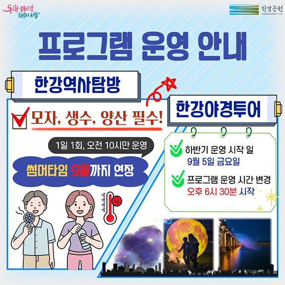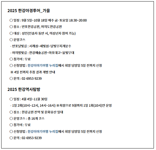 ‘한강역사탐방’과 ‘한강야경투어’는 모두 무료로 진행되며, 서울시 ‘한강이야기여행’ 누리집을 통해 간편하게 신청할 수 있어요.