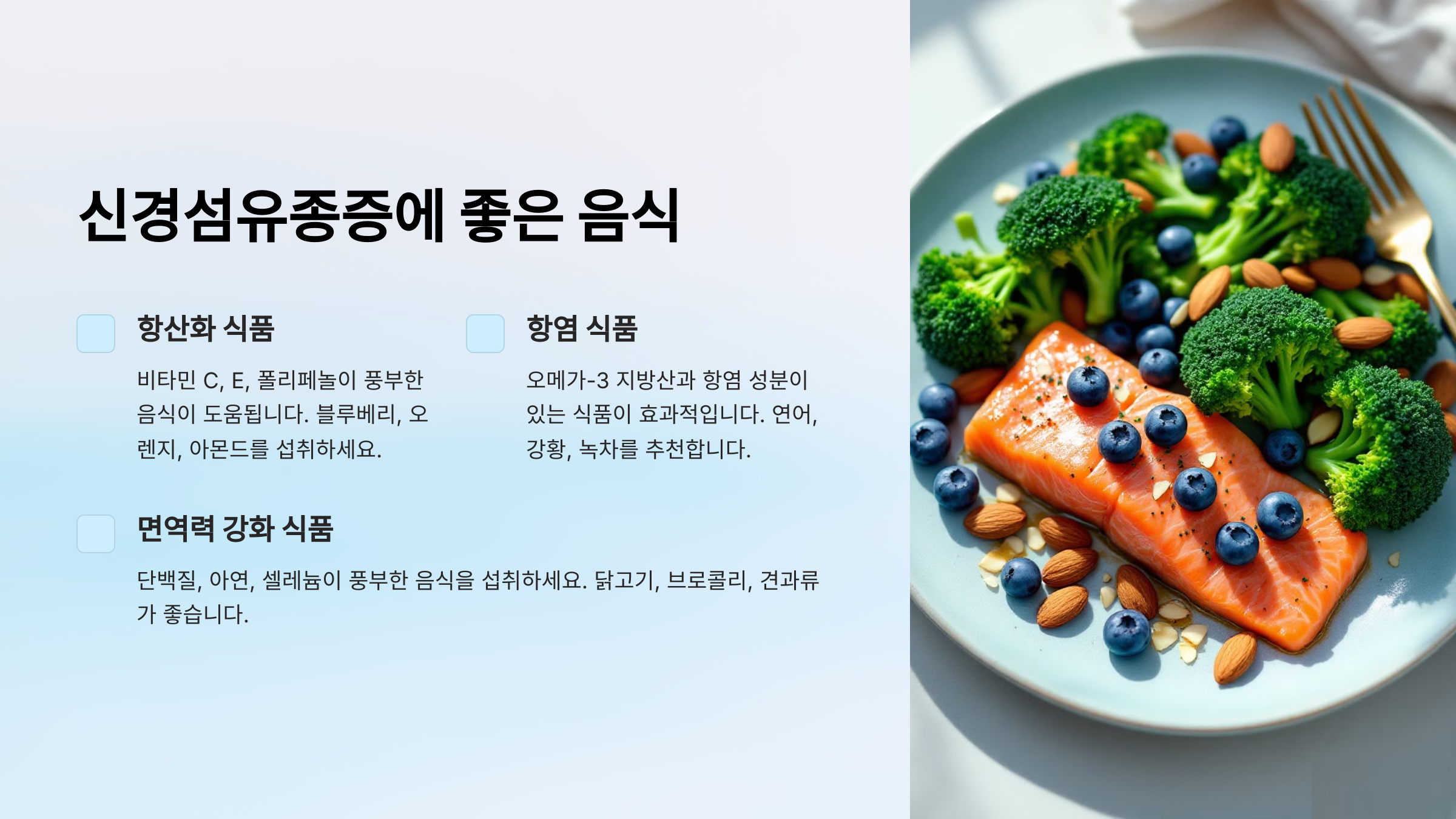 👉 항산화 및 항염 식품(베리류, 연어, 강황 등)을 꾸준히 섭취하세요.