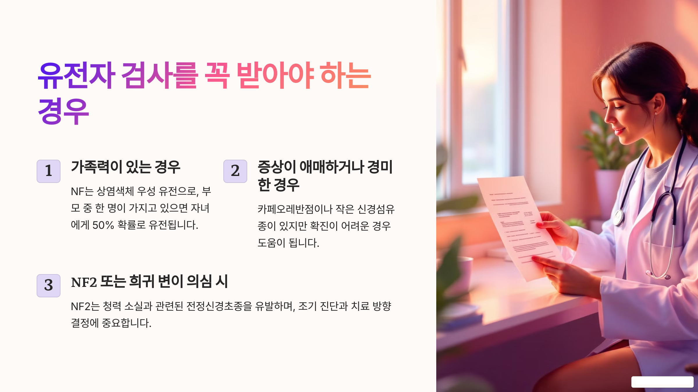 📌 NF가 의심된다면, 전문가와 상담 후 유전자 검사를 고려해 보세요! 🏥