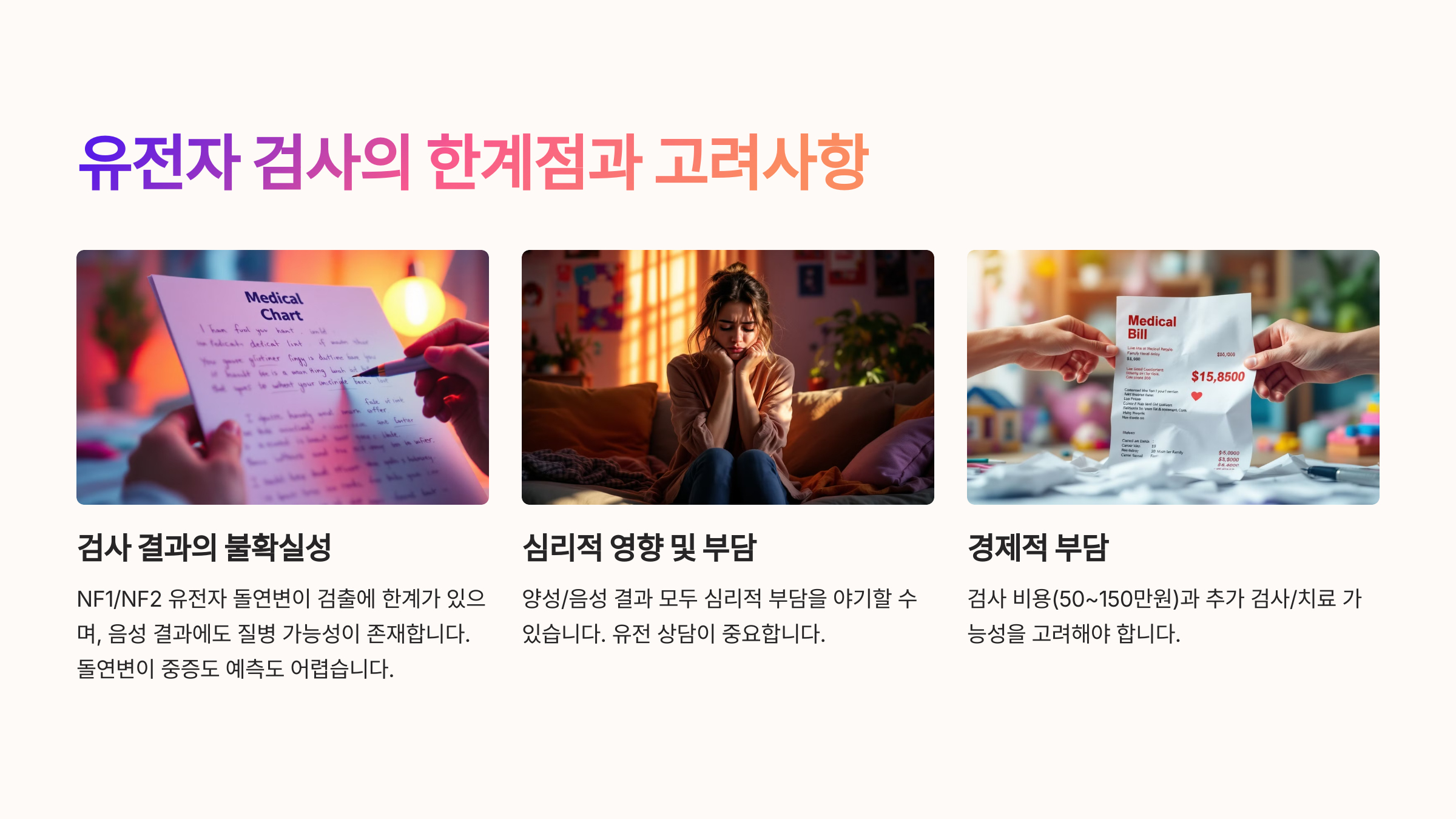- 유전자 검사는 환자와 가족에게 심리적 부담을 줄 수 있음