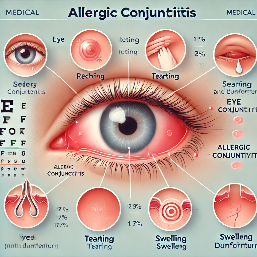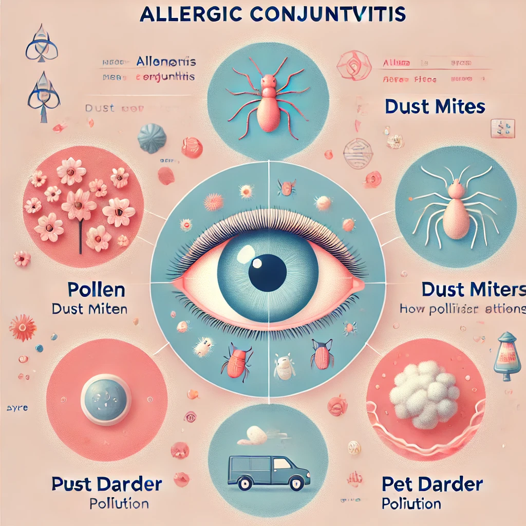 알레르기성 결막염은 외부의 알레르기 유발 물질(알레르겐)에 의해 눈의 결막이 염증을 일으키는 질환입니다. 주로 꽃가루, 집먼지 진드기, 애완동물의 털, 곰팡이 포자 등이 원인이 되며, 가려움증, 충혈, 눈물 흘림 등의 증상을 유발합니다.