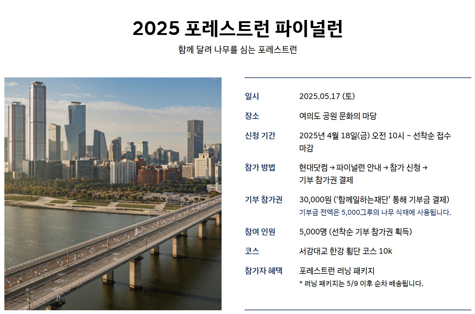 포레스트런 2025는 현대자동차가 주최하는 기부형 친환경 러닝 캠페인이에요.
