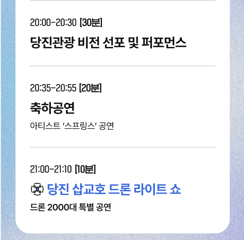 올해 드론 라이트 쇼의 핵심은 바로 ‘2,000대의 드론’입니다. 개막일에는 ‘2025~2026 충남 당진 방문의 해’를 기념하는 특별 메시지를 담은 연출이 펼쳐진다고 해요. 밤하늘을 무대로 펼쳐지는 드론 퍼포먼스는 단순한 볼거리를 넘어서 당진의 미래 관광 비전을 시각적으로 그려주는 예술 작품 같았어요.
