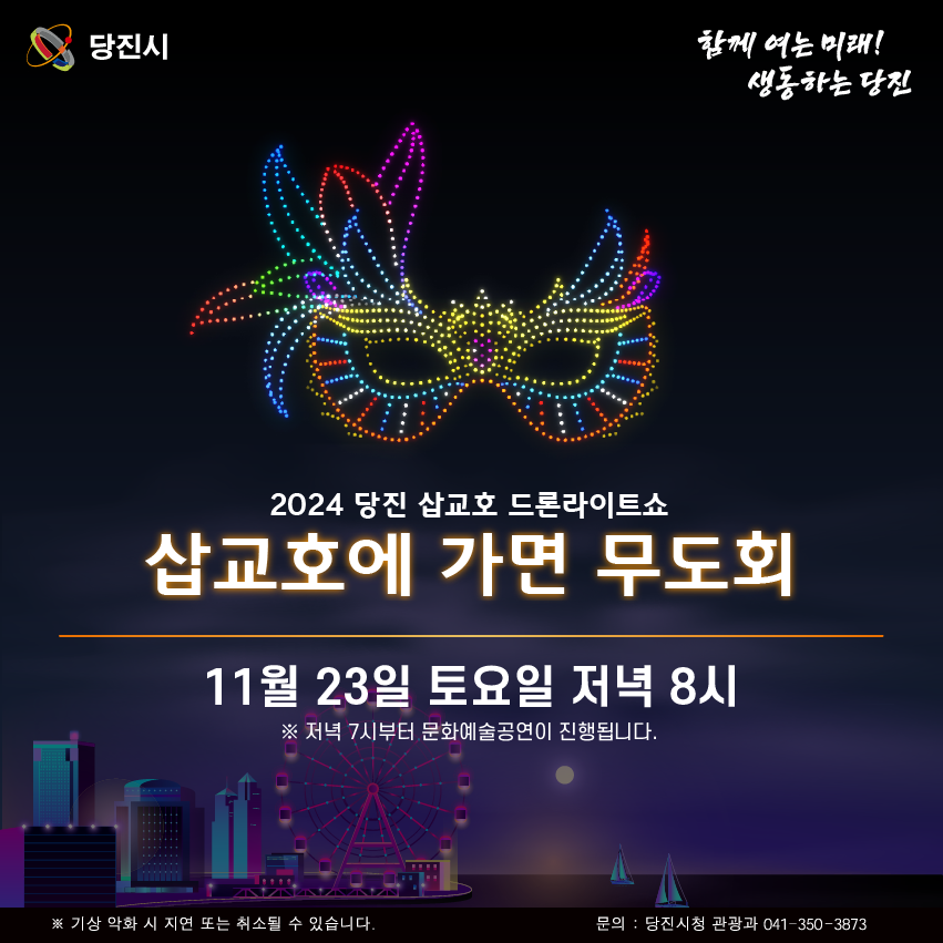 ‘2025 당진 삽교호 드론 라이트 쇼’의 개막일은 단순한 행사 그 이상이에요. 4월 19일 토요일 저녁 7시, 사전 공연으로 시작되는 이 축제는 전통 풍물놀이와 뮤지컬 배우들의 무대까지 곁들여져 분위기를 한껏 끌어올려줍니다. 이어서 8시부터 본 공연이 시작되며, 당진의 관광 비전을 선포하는 특별 세리머니, 밴드 ‘스프링스’의 감성 넘치는 공연, 그리고 대망의 드론 라이트 쇼가 순차적으로 이어집니다. 공연 흐름이 자연스럽고 풍성해서 하루 저녁이 전혀 지루하지 않아요.