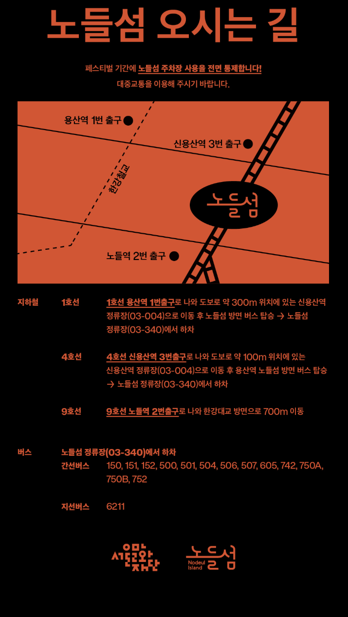 | 버스 | 노들섬입구 또는 노량진역 하차 |