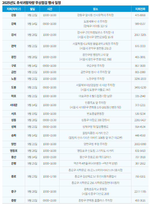 이번 무상점검 행사는 2025년 9월 14일부터 28일까지 서울시 22개 자치구에서 진행됩니다. 다만 구마다 일정이 다르므로, 가까운 지역의 일정을 확인하고 방문하는 것이 좋아요.
