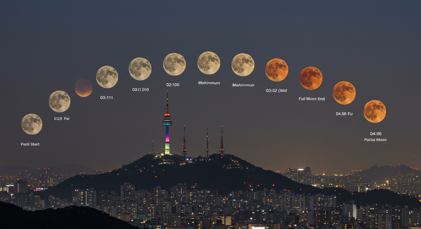 서울 독자분들 반가워요! 이번 개기월식은 9월 8일(월) 새벽에 서울 전역에서 전 과정이 관측 가능한, 보기 드문 “풀 코스” 이벤트예요.