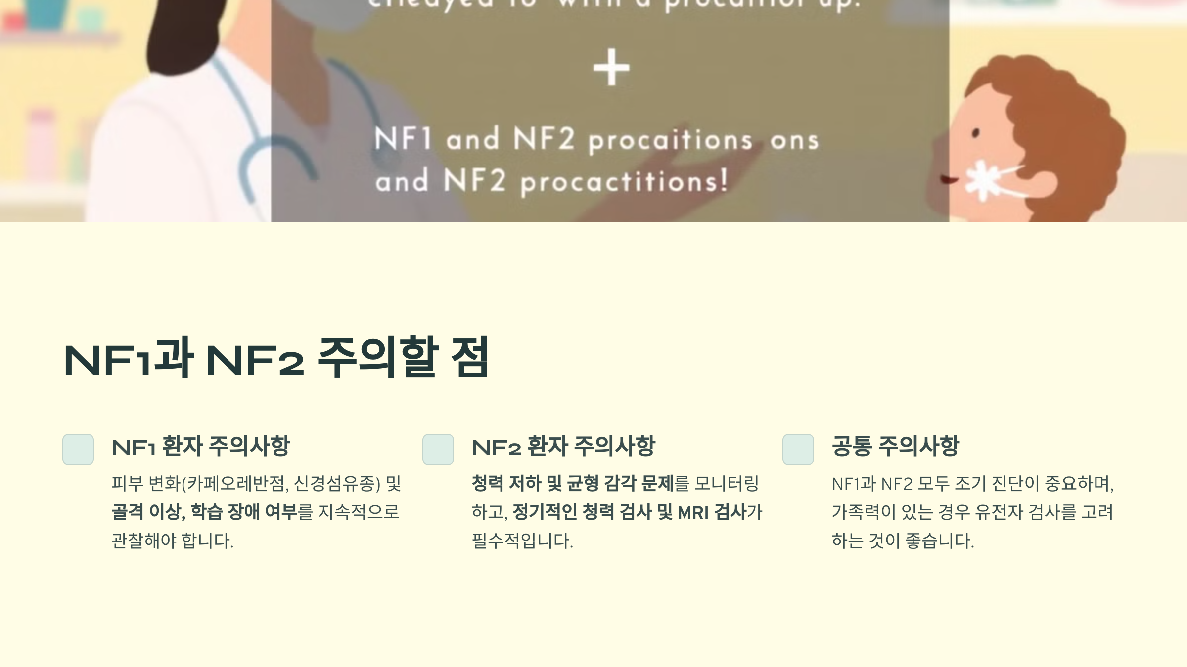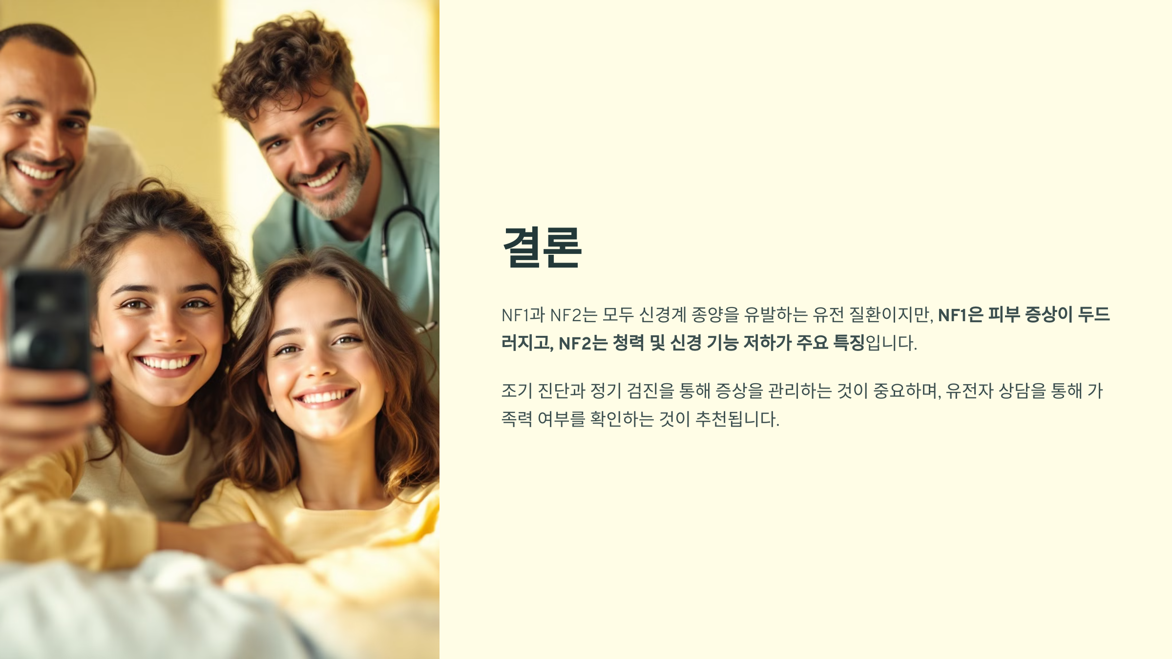 NF1 또는 NF2가 의심된다면 유전자 검사 및 전문의 상담을 받는 것이 중요합니다! 👩⚕️💙