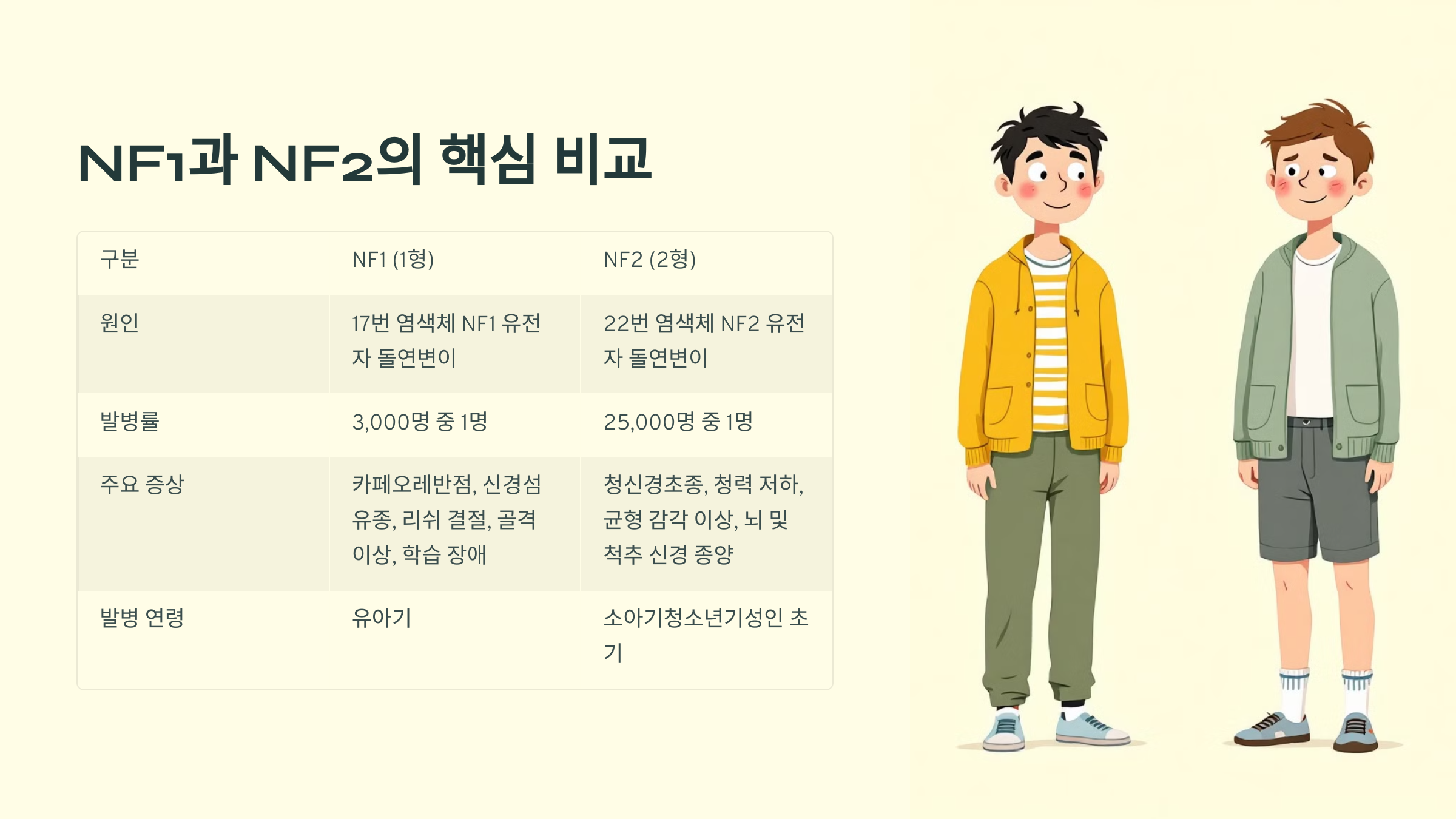 NF1과 NF2는 모두 유전적 질환이지만, 증상과 치료 방식에서 차이가 큽니다. NF1은 피부 증상이 두드러지는 반면, NF2는 청력 소실과 신경초종이 주요 증상입니다.